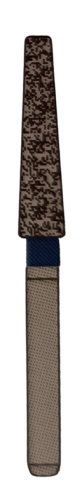 Рабочая часть в форме удлиненного конуса с диаметром сечения 2,3 мм покрыта алмазным напылением средней зернистости, что обеспечивает эффективное удаление материала. Хвостовик гарантирует устойчивость при вращении турбинного наконечника до 300 тыс. об/мин, снижая вибрацию и повышая долговечность инструмента.